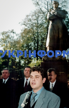 Степан Бандера – внук голови проводу Організації українських націоналістів (ОУН) Степана Бандери виступає з промовою в день відкриття та освячення пам’ятника дідові в парку Степана Бандери, Дрогобич, Львівська область, 14 жовтня 2001 року. Фото Олександра Барана.