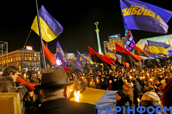 Учасники акції із нагоди 99-ї річниці від дня народження провідника Організації українських націоналістів (ОУН) Степана Бандери пройшли ходою зі смолоскипами та прапорами від бульвару Шевченка до Майдану Незалежності, Київ, 1 січня 2008 року. Фото Павла Багмута.