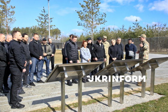 Заступниця керівника Офісу Президента України Ірина Верещук, керівник Офісу Президента України Кирило Буданов, міністерка у справах ветеранів України Наталія Калмикова (справа наліво) оглядають територію Національного військового меморіального кладовища, Київська область, 28 березня 2026 року.