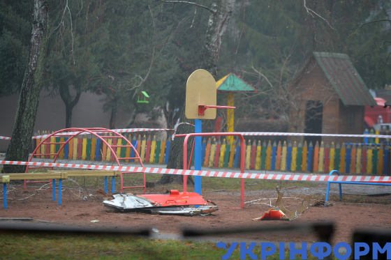 Уламки від гвинтокрила ДСНС України ЕС-225 на дитячому майданчику. Вертоліт впав поблизу дитячого садка, на місці падіння виникла пожежа. Унаслідок авіакатастрофи загинуло керівництво МВС. Серед жертв трагедії — четверо дітей. Бровари, Київська область, 18 січня 2023 року.