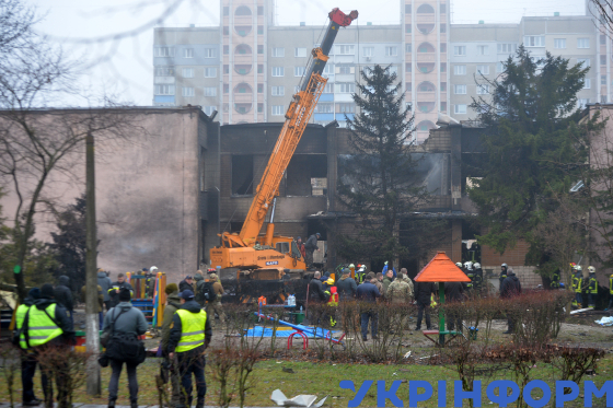 Рятувальники працюють на місці падіння гвинтокрила ДСНС України ЕС-225 у Броварах. Вертоліт впав поблизу дитячого садка, на місці падіння виникла пожежа. Унаслідок авіакатастрофи загинуло керівництво МВС. Серед жертв трагедії — четверо дітей. Бровари, Київська область, 18 січня 2023 року.