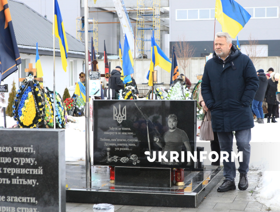 Міський голова Бучі Анатолій Федорук йде Алеєю Героїв на міському кладовищі у Бучі під час вшанування пам`яті загиблих військових і цивільних українців у четверті роковини повномасштабного вторгнення Росії в Україну, Бучанський район, Київська область, 24 лютого 2026 року.