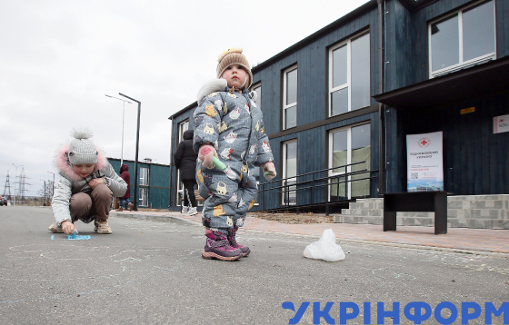 Діти малюють крейдою на асфальті на території побудованого за підтримки Товариства Червоного Хреста України модульного містечка для тимчасового проживання ВПО, де розміщено сім багатоквартирних двоповерхових будинків, які розраховані на 112 квартир, Чернігів, 22 листопада 2023 року.