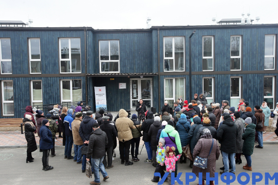 Учасники церемонії відкриття побудованого за підтримки Товариства Червоного Хреста України модульного містечка для тимчасового проживання ВПО, де розміщено сім багатоквартирних двоповерхових будинків, які розраховані на 112 квартир, Чернігів, 22 листопада 2023 року.