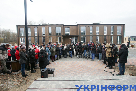 Учасники церемонії відкриття побудованого за підтримки Товариства Червоного Хреста України модульного містечка для тимчасового проживання ВПО, де розміщено сім багатоквартирних двоповерхових будинків, які розраховані на 112 квартир, Чернігів, 22 листопада 2023 року.