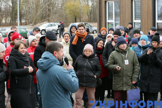 Учасники церемонії відкриття побудованого за підтримки Товариства Червоного Хреста України модульного містечка для тимчасового проживання ВПО, де розміщено сім багатоквартирних двоповерхових будинків, які розраховані на 112 квартир, Чернігів, 22 листопада 2023 року.