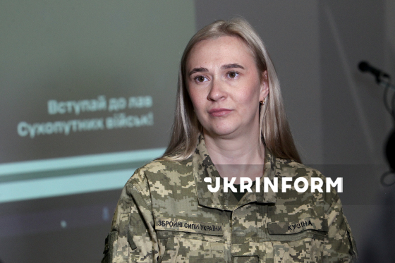 Начальниця групи комунікацій Дніпропетровського обласного ТЦК та СП майор Олена Кузіна дає коментар журналістам під час відкриття фотовиставки “Народ, що став військом”, приуроченої до четвертої річниці повномасштабного вторгнення Росії в Україну та організованої 1 Центром інформаційно-комунікаційної підтримки Сухопутних військ ЗСУ спільно з Дніпропетровським обласним територіальним центром комплектування та соціальної підтримки, у залі Музею сучасної російсько-української війни, Дніпро, 26 лютого 2026 року.
