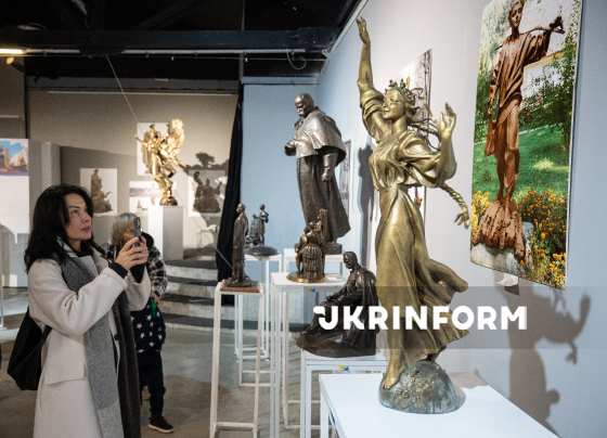 Відвідувачі фотографують скульптури на відкритті виставки скульптора Анатолія Куща “Парадигма гармонійного” у залі Київської міської галереї мистецтв “Лавра”, Київ, 15 листопада 2025 року. В експозиції представлено понад 200 робіт, частина з них виставляється вперше. До найвідоміших робіт Анатолія Куща належать монумент Незалежності України, скульптурна композиція, присвячена засновникам Києва, і пам`ятник Архистратигу Михаїлу.