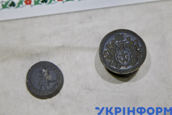 Печатки Війська Запорозького (1648 р.) і гетьмана Богдана Хмельницького (1649 р.) демонструються на відкритті виставкового проєкту “Скарби державності” з нагоди Дня Української Державності в Інформаційно-виставковому центрі Музею Майдану, Київ, 15 липня 2025 року.