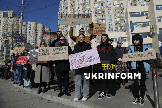 Активісти з плакатами мітингують під час чергової акції-нагадування "Не мовчи! Полон вбиває!" на підтримку військовополонених та зниклих безвісти, що відбулася на перетині Дніпровської набережної та вулиці Анни Ахматової поблизу станції метро "Осокорки", Київ, 15 березня 2026 року.