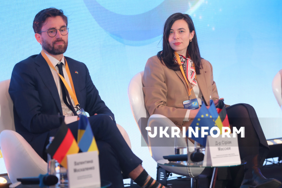 Старший політичний радник Федерального міністерства економіки та енергетики Німеччини Сіріак Массюе та директорка Європейсько-українського енергетичного агентства Анастасія Верещинська беруть участь у Німецько-українському енергетичному дні-2026, у межах якого українські та європейські урядовці, представники енергетичного бізнесу та експерти говорили про відновлення енергетичної системи України та її інтеграцію до енергетичного ринку Європи, Київ, 12 березня 2026 року. Захід відбувся в межах енергетичного партнерства між Україною та Німеччиною.