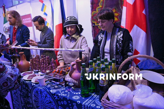 Жінки продають солодкі напої, шашлик і чурчхелу (традиційні кавказькі ласощі з нанизаних на нитку горіхів, вкритих загущеним фруктовим соком з додаванням борошна) на щорічному благодійному різдвяному дипломатичному ярмарку Charity Fair 2025, який традиційно організовується Асоціацією "Подружжя українських дипломатів" за підтримки Міністерства закордонних справ України, що відбувся в одному з павільйонів на ВДНГ, Київ, 29 листопада 2025 року.