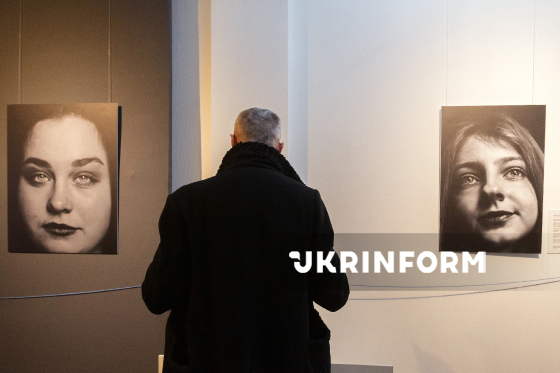 Відвідувач роздивляється експонати виставки "Ниточка: Трансформація замість зламаності" - спільного проєкту БФ "Голоси дітей" та фотографині Марти Сирко, присвяченого дитячому досвіду війни, - до четвертих роковин повномасштабного російського вторгнення в Україну, Київ, 19 лютого 2026 року.