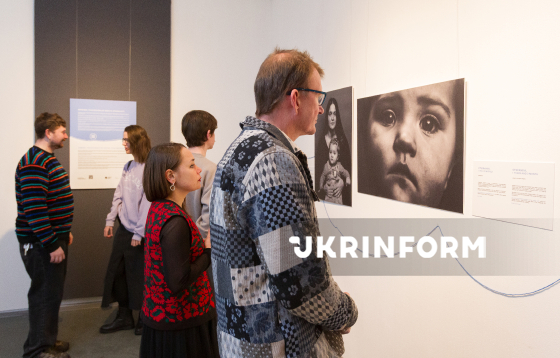 Відвідувачі роздивляються експонати виставки "Ниточка: Трансформація замість зламаності" - спільного проєкту БФ "Голоси дітей" та фотографині Марти Сирко, присвяченого дитячому досвіду війни, - до четвертих роковин повномасштабного російського вторгнення в Україну, Київ, 19 лютого 2026 року.