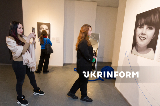 Відвідувачка фотографує під час виставки "Ниточка: Трансформація замість зламаності" - спільного проєкту БФ "Голоси дітей" та фотографині Марти Сирко, присвяченого дитячому досвіду війни, - до четвертих роковин повномасштабного російського вторгнення в Україну, Київ, 19 лютого 2026 року.
