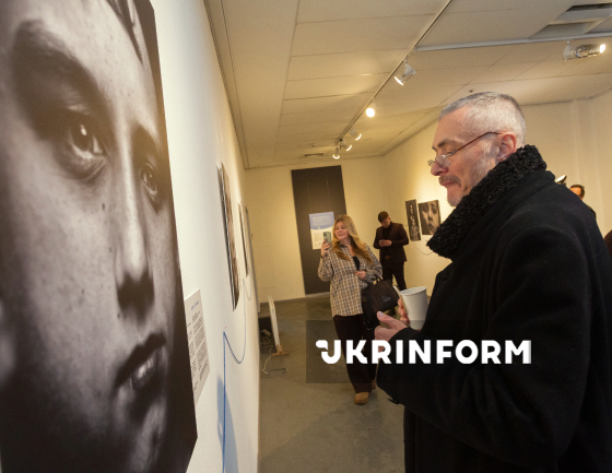 Відвідувачк роздивляється експонати виставки "Ниточка: Трансформація замість зламаності" - спільного проєкту БФ "Голоси дітей" та фотографині Марти Сирко, присвяченого дитячому досвіду війни, - до четвертих роковин повномасштабного російського вторгнення в Україну, Київ, 19 лютого 2026 року.