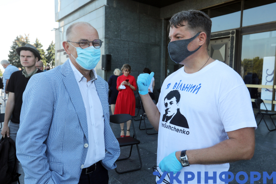 Генеральний директор Укрінформу Олександр Харченко і звільнений з російського полону політв`язень, власний кореспондент Укрінформу Роман Сущенко (зліва направо) під час відкриття виставки “Вільні”, присвяченої українцям, які були заарештовані й засуджені російською федерацією та “ДНР” і “ЛНР”, на території Меморіального комплексу “Національний музей історії України у Другій світовій війні”, Київ, 10 вересня 2020 року.