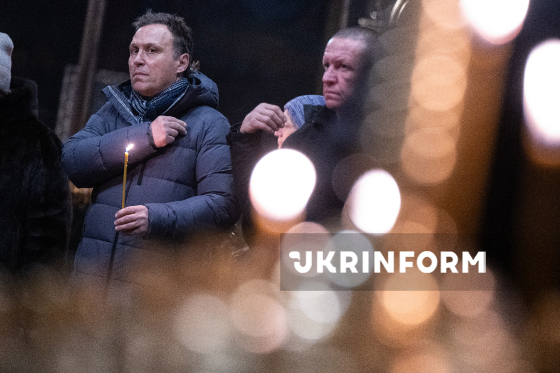 Директор Національного меморіального комплексу Героїв Небесної Сотні - Музею Революції Гідності Ігор Пошивайло (ліворуч) бере участь у поминальному богослужінні за Героями Небесної Сотні з нагоди 12-х роковин трагічних подій Революції Гідності у Свято-Михайлівському Золотоверхому соборі, Київ, 18 лютого 2026 року.