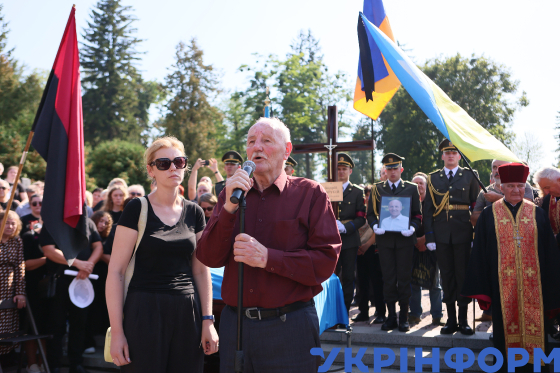 Учасник виголошує пам’ятну промову під час церемонії прощання з українським громадським діячем, політиком, ексголовою Верховної Ради України Андрієм Парубієм, якого було вбито 30 серпня у Львові, на Личаківському кладовищі, Львів, 2 вересня 2025 року.