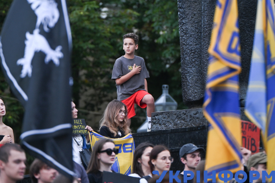 Хлопчик виконує державний гімн України під час реквієму пам`яті за загиблими внаслідок теракту в Оленівці українськими військовими у День вшанування пам`яті захисників та захисниць України, учасників добровольчих формувань та цивільних осіб, які були страчені, закатовані або загинули у полоні, на площі перед пам`ятником Тарасові Шевченку, Львів, 28 липня 2025 року.