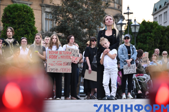 Жінка обіймає сина під час реквієму пам`яті за загиблими внаслідок теракту в Оленівці українськими військовими у День вшанування пам`яті захисників та захисниць України, учасників добровольчих формувань та цивільних осіб, які були страчені, закатовані або загинули у полоні, на площі перед пам`ятником Тарасові Шевченку, Львів, 28 липня 2025 року.