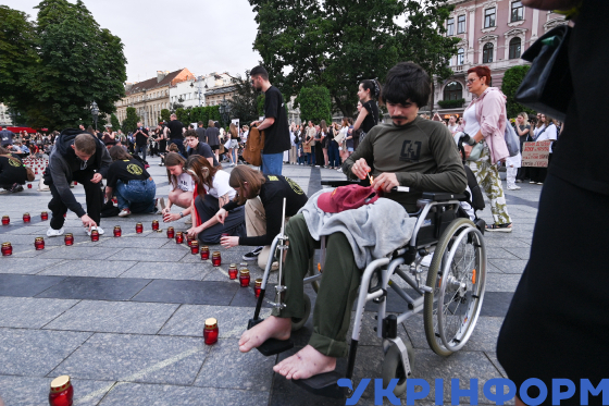 Військовий на кріслі колісному запалює лампадку за загиблими під час теракту в Оленівці українськими захисниками у День вшанування пам`яті захисників та захисниць України, учасників добровольчих формувань та цивільних осіб, які були страчені, закатовані або загинули у полоні, на площі перед пам`ятником Тарасові Шевченку, Львів, 28 липня 2025 року.