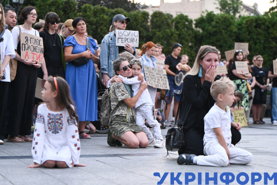 Жінки з дітьми навколішки вшановують пам`ять загиблих внаслідок теракту в Оленівці українських військових у День вшанування пам`яті захисників та захисниць України, учасників добровольчих формувань та цивільних осіб, які були страчені, закатовані або загинули у полоні, на площі перед пам`ятником Тарасові Шевченку, Львів, 28 липня 2025 року.