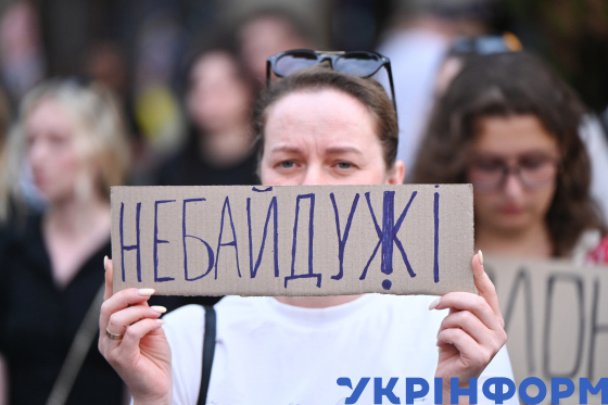 Жінка тримає плакат з написом "Небайдужі" під час реквієму пам`яті за загиблими внаслідок теракту в Оленівці українськими військовими у День вшанування пам`яті захисників та захисниць України, учасників добровольчих формувань та цивільних осіб, які були страчені, закатовані або загинули у полоні, на площі перед пам`ятником Тарасові Шевченку, Львів, 28 липня 2025 року.