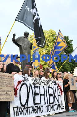 Містяни вшановують пам`ять військовополонених, які загинули внаслідок теракту в Оленівці, у День вшанування пам`яті захисників та захисниць України, учасників добровольчих формувань та цивільних осіб, які були страчені, закатовані або загинули у полоні, на площі перед пам`ятником Тарасові Шевченку, Львів, 28 липня 2025 року.