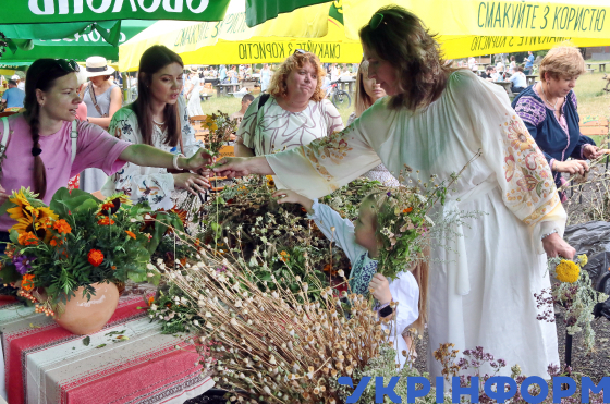 Учасниці майстер-класу зі створення традиційного букета "маковійчика" у межах святкового дійства, присвяченого Медовому Спасу (Маковія) та українським традиціям літа, на території Національного музею народної архітектури та побуту України, Київ, 26 липня 2025 року.