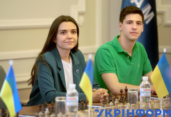 Учасники сеансу одночасної гри в шахи, присвяченого головуванню України в організації ГУАМ у 2019 році, який провели чемпіон Всесвітньої шахової олімпіади, міжнародний гросмейстер Антон Коробов (Україна) та міжнародний майстер Анастасія Рахмангулова (Україна) в рамках відкритого турніру ГУАМ з шахів, у приміщенні Секретаріату ГУАМ, Київ, 31 травня 2019 року.