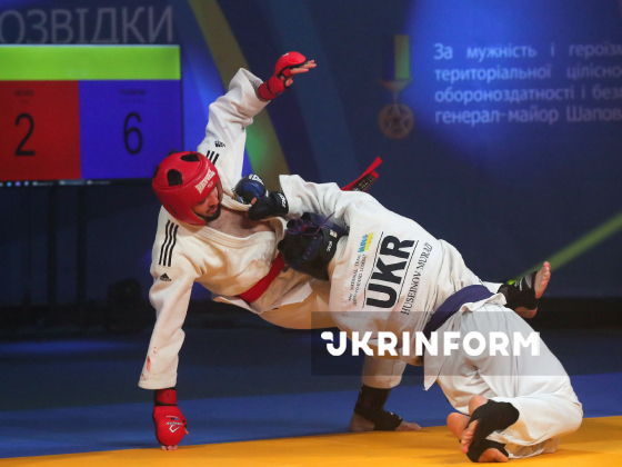 Спортсмен Мурад Гусейнов (праворуч) бере участь у спарингу фіналу ІІІ чемпіонату України з рукопашного бою у категорії 75 кг, присвяченого пам’яті Героя України генерал-майора Максима Шаповала, Київ, 22 березня 2026 року. Співробітник Головного управління розвідки Міністерства оборони України Максим Шаповал загинув 27 червня 2017 року в Солом’янському районі столиці внаслідок підриву автомобіля. Указом Президента від 30 червня 2017 року №169/2017 йому надано військове звання генерал-майора (посмертно), а 7 вересня 2017 року - присвоєно звання Героя України з удостоєнням ордена "Золота Зірка" (посмертно).