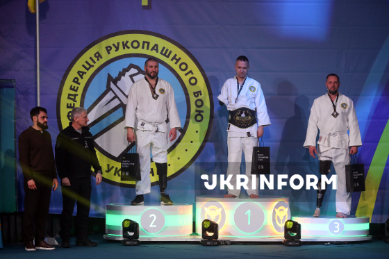 Спортсмени беруть участь церемонії нагородження призерів фіналу ІІІ чемпіонату України з рукопашного бою, присвяченого пам’яті Героя України генерал-майора Максима Шаповала, Київ, 22 березня 2026 року. Співробітник Головного управління розвідки Міністерства оборони України Максим Шаповал загинув 27 червня 2017 року в Солом’янському районі столиці внаслідок підриву автомобіля. Указом Президента від 30 червня 2017 року №169/2017 йому надано військове звання генерал-майора (посмертно), а 7 вересня 2017 року - присвоєно звання Героя України з удостоєнням ордена "Золота Зірка" (посмертно).