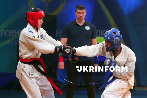 Спортсмени Максим Несторяк (ліворуч) та Вадим Сакал беруть участь у спарингу фіналу ІІІ чемпіонату України з рукопашного бою, присвяченого пам’яті Героя України генерал-майора Максима Шаповала, Київ, 22 березня 2026 року. Співробітник Головного управління розвідки Міністерства оборони України Максим Шаповал загинув 27 червня 2017 року в Солом’янському районі столиці внаслідок підриву автомобіля. Указом Президента від 30 червня 2017 року №169/2017 йому надано військове звання генерал-майора (посмертно), а 7 вересня 2017 року - присвоєно звання Героя України з удостоєнням ордена "Золота Зірка" (посмертно).