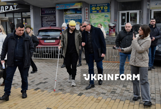 Заступник начальника Вінницької ОВА Андрій Кавунець, ветеран російсько-української війни Андрій Соловко, заступник міського голови Вінниці Владислав Скальський (зліва направо) тестують пілотний безбар’єрний маршрут, реалізований на Вінниччині в межах флагманського проєкту Міністерства розвитку громад та територій України “Рух без бар`єрів”, на Майдані Небесної Сотні, Вінниця, 26 листопада 2025 року.