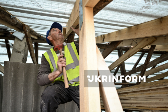 Фахівець ремонтує дах одного з двоповерхових будинків, що зазнали руйнувань внаслідок російського обстрілу Запоріжжя наприкінці 2025 року, Запоріжжя, 31 березня 2026 року. За останні два місяці комунальні служби демонтували близько 770 кв. м шиферного даху, уклали нову мембрану та обрешітку і відремонтували стропильні конструкції. З початку року у Запоріжжі відновили дахи приблизно на 4 000 кв. м у шести будинках. Ще більш як 10 000 кв. м покрівель зараз ремонтуються на дев’яти будинках. Планується ремонт покрівлі ще одинадцяти будинків.