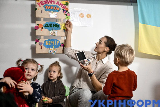 Вихователька та діти граються під час заняття у закладі дошкільної освіти (ясла-садок) №100 “Гармонія”, Запоріжжя, 21 жовтня 2025 року. Вперше з початку повномасштабного вторгнення РФ в Україну у Запоріжжі відновили роботу тринадцять ясельних груп для дітей до трьох років у дев`яти закладах дошкільної освіти. Працюють вони у скороченому режимі — до трьох годин.