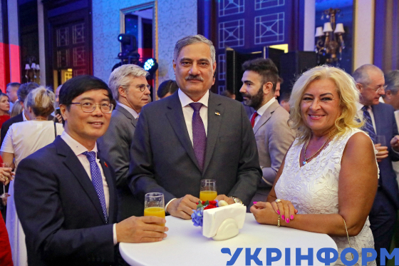 Надзвичайний і Повноважний Посол Соціалістичної Республіки В’єтнам в Україні та Республіці Молдова д-р Нгуєн Хоан Тхань, Надзвичайний і Повноважний Посол Ісламської Республіки Пакистан Й.В. генерал-майор (у відставці) Надір Хан та перший секретар Посольства Словацької Республіки в Україні Драгоміра Трновцова (зліва направо) під час урочистого прийому з нагоди Національного свята Французької Республіки - 235-ї річниці взяття Бастилії, Київ, 17 липня 2024 року.