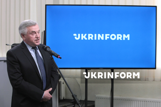 Голова Державного комітету з питань телебачення і радіомовлення Олег Наливайко виступає з промовою на урочистому заході з нагоди 108-ї річниці від дня заснування Українського національного інформаційного агентства “Укрінформ”, Київ, 16 березня 2026 року.