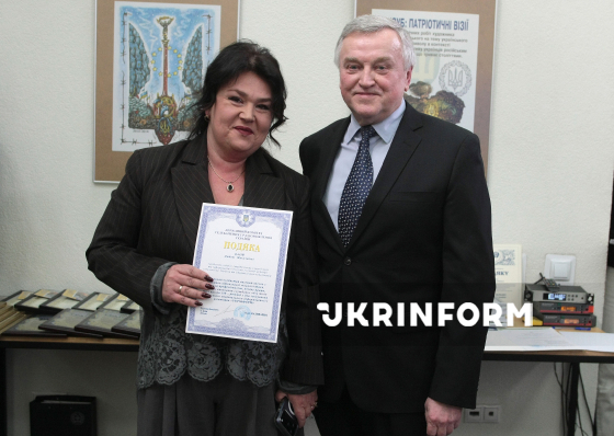 Голова Державного комітету з питань телебачення і радіомовлення Олег Наливайко та журналістка Любов Базів позують для фото під урочистого заходу з нагоди 108-ї річниці від дня заснування Українського національного інформаційного агентства “Укрінформ”, Київ, 16 березня 2026 року.