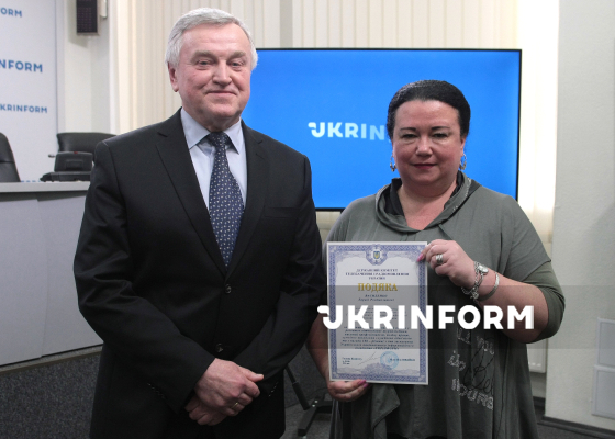 Голова Державного комітету з питань телебачення і радіомовлення Олег Наливайко та Лариса Василенко позують для фото під час вручення грамот працівникам Укрінформу на урочистому заході з нагоди 108-ї річниці від дня заснування Українського національного інформаційного агентства “Укрінформ”, Київ, 16 березня 2026 року.