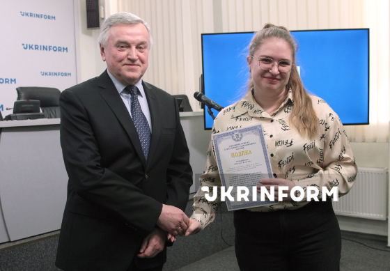 Голова Державного комітету з питань телебачення і радіомовлення Олег Наливайко вручає подяку Катерині Грабовенко на урочистому заході з нагоди 108-ї річниці від дня заснування Українського національного інформаційного агентства “Укрінформ”, Київ, 16 березня 2026 року.