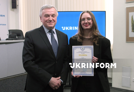 Голова Державного комітету з питань телебачення і радіомовлення Олег Наливайко та Галина Тибінь позують для фото під час вручення відзнак працівникам Укрінформу на урочистому заході з нагоди 108-ї річниці від дня заснування Українського національного інформаційного агентства “Укрінформ”, Київ, 16 березня 2026 року.