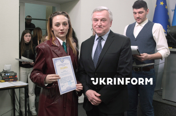 Голова Державного комітету з питань телебачення і радіомовлення Олег Наливайко та журналістка Світлана Ткачук позують для фото під час вручення відзнак працівникам Укрінформу на урочистому заході з нагоди 108-ї річниці від дня заснування Українського національного інформаційного агентства “Укрінформ”, Київ, 16 березня 2026 року.