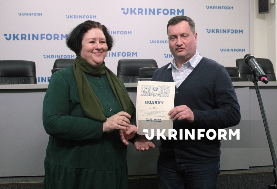 Керівник напряму стратегічних комунікацій Головного управління розвідки Міністерства оборони Андрій Юсов вручає подяку Юліані Шевчук під урочистого заходу з нагоди 108-ї річниці від дня заснування Українського національного інформаційного агентства “Укрінформ”, Київ, 16 березня 2026 року.