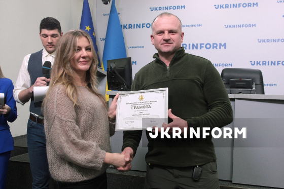Начальник Управління комунікацій командування Сухопутних військ Андрій Подік вручає грамоту командувача Сухопутних військ ЗСУ Мирославі Липі під урочистого заходу з нагоди 108-ї річниці від дня заснування Українського національного інформаційного агентства “Укрінформ”, Київ, 16 березня 2026 року.