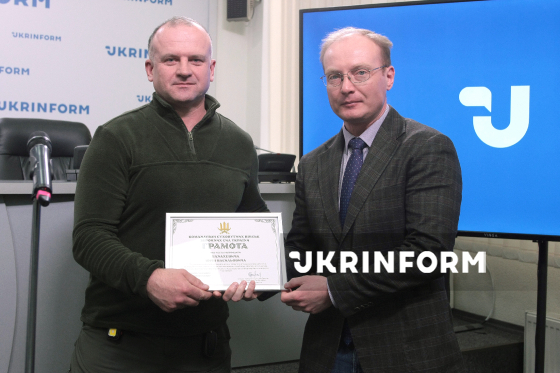 Начальник Управління комунікацій командування Сухопутних військ Андрій Подік (ліворуч) вручає грамоту командувача Сухопутних військ ЗСУ для власного кореспондентки Укрінформу в Польщі Юрія Банахувича головному редактору Головної редакції зарубіжної інформації та іномовлення Віталію Федяніну під урочистого заходу з нагоди 108-ї річниці від дня заснування Українського національного інформаційного агентства “Укрінформ”, Київ, 16 березня 2026 року.
