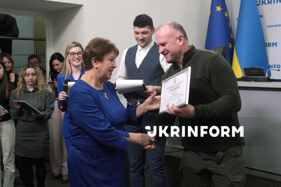 Начальник Управління комунікацій командування Сухопутних військ Андрій Подік (ліворуч) вручає грамоту командувача Сухопутних військ ЗСУ під урочистого заходу з нагоди 108-ї річниці від дня заснування Українського національного інформаційного агентства “Укрінформ”, Київ, 16 березня 2026 року.