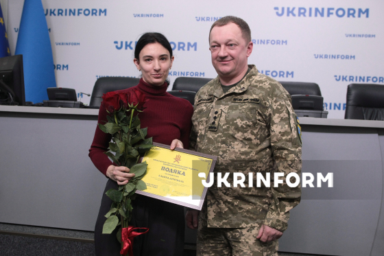 Заступник начальника штабу Командування Сил територіальної оборони Збройних сил України Дмитро Бородавко вручає подяку Альоні Дригваль під час урочистого заходу з нагоди 108-ї річниці від дня заснування Українського національного інформаційного агентства “Укрінформ”, Київ, 16 березня 2026 року.