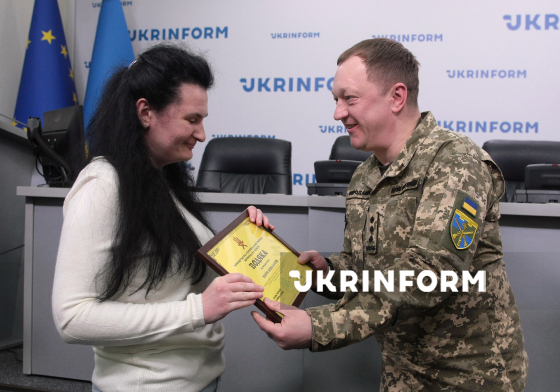 Заступник начальника штабу Командування Сил територіальної оборони Збройних сил України Дмитро Бородавко вручає подяку Марії Ковальчук під час урочистого заходу з нагоди 108-ї річниці від дня заснування Українського національного інформаційного агентства “Укрінформ”, Київ, 16 березня 2026 року.